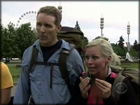 Back at the actual road block park, Nick was counting statues and Starr was at the clue box waiting for Nick to figure it out and meet her there. Nick had his 6 and 2 numbers and went to go find the shop keeper. He felt pretty confident in his numbers even though there were so many statues in the park. Dallas was still trying to figure the statues out. Toni had arrived at the clue box to wait with Starr. Team S&M arrived at the road block. Tina decided to do it. Then Tina started yelling at it was raining and the jacket she was putting on didn’t have a hood on it. Oh, if you lived in the Northwest like me, you would have hoods on all jackets! While Ken was trying to help give her his jacket, she was yelling at him to shut up. Nick ran past them and got in their cab to go to the shop. He was thrilled the cab had GPS.  Ken was wishing Tina good luck and she was telling him to get out of there since he couldn’t help her with the road block. She told him he might as well go. Ah, the love! She found a Stalin statue right away. I am not sure if Dallas had identified anyone yet. The frat boys were still driving. Ken arrived at the clue box to wait for Tina. Dallas finally found a Stalin statue. It appeared that Dallas was getting Stalin and Lenin mixed up since he counted about 4 Stalins and one Lenin and who he was looking at was the other guy.