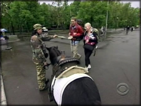 The siblings got off at the station to look for the statue. One passenger on the bus with Team S&M asked where they were trying to go and then when Tina said they wanted to be on a trolley bus, the lady told them it wasn’t a trolley bus. The siblings turned over their pastry to the little old lady next to the statue and she handed them the postcard with the next clue. It was back on the metro for them! Team S&M got off at the next stop, saw which bus was a trolley bus (it was connected to the wires), and then took a taxi back to the park so they could start over again correctly. At least they learned that it doesn’t pay to not do the clue correctly.  Back at the Russian dancing, the frat boys actually completed it well enough to the instructor’s liking so they got their next clue. They got their clue to go talk to the pony lady. She gave them the detour clue. The picked Ride the Lines. At that time, Toni & Dallas had arrived back at the apartment and found a taxi to take them back to the park.