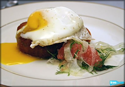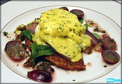 Poached Egg, Pancetta, Potato Rosti & Grape Ragout with Hollandaise