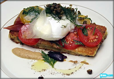 Poached Egg on Herb Brioche, Prosciutto, Manchego & Spanish Olive Tapenade