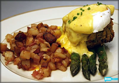 Crab Cake Eggs Benedict, Asparagus & Bacon Potato Mash in Hollandaise