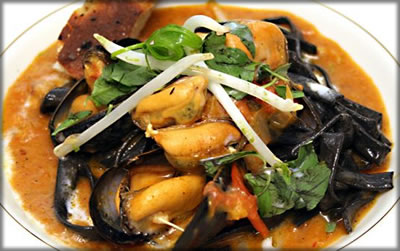 Pineapple Red Curry Mussels with Squid Ink Pasta & Focaccia