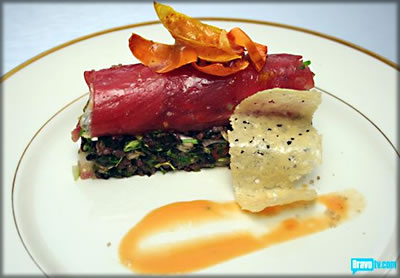 Braised Beef Short Rib, Squash, Potato & Carrot Confit & Tempura Horseradish