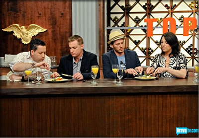 After shopping, the chefs got back to the kitchen to see some past contestants sitting there with the judges. There was Mike Isabella from season 6, Bryan Voltaggio from season 6,and  Spike Mendelsohn (with his stupid hat) from season 4, along with judges Beth Scott from Hilton, Nora Puillon (chef/owner of Nora), Tom Colicchio, and Eric Ripert. After the introductions, they had 30 minutes to cook breakfast.