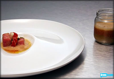 Poached Tuna with Fenugreek Broth, Tomatoes, Soy Sauce & Honey