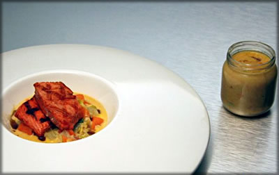 Salmon with Vegetable Chowder & Lobster Stock, Thai Basil & Licorice Oil