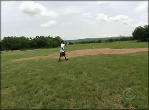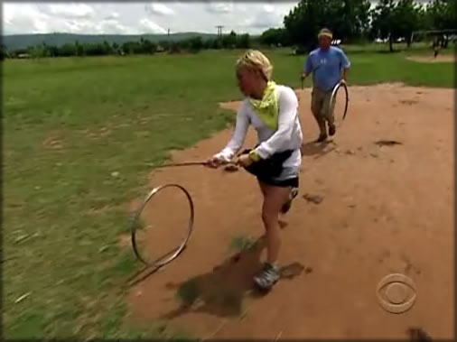 Gary breezed through the wheel and stick. He made it down one side of the field and was waiting for Mallory to do it all the way. She kept praying to Jesus to help her since this is important enough to pray about and Gary just kept telling her to do it when she whined about how hot it was. She looked like she was wearing a heavy long-sleeved shirt with her bandanna around her neck. I would imagine her being hot dressed like that.
