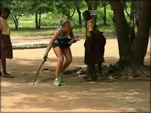 Back at the school yard, the home shopping queens turned in all their supplies to the foreman and moved onto the geography task. Brook guessed that Ghana was on the west side of the continent, but pretty close to South Africa, which isn’t correct. She thought it was in that area though. The tattoo couple was the first one of the big group to arrive at the foreman. They had brought two bags of cement when they only needed one. Nick told her it was fifth-grade reading. I seem to remember, he didn’t know what a flag was in the first leg!