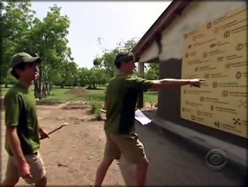The tattoo couple showed up to the foreman with all the correct supplies and moved onto the geography task. The home shopping queens were showing off their continued reading comprehension by reading the language clue and thinking they had to circle the eight children that were dancing around. What does that have to do with words? Oh dear. Then, Chad & Stephanie and the volleyball girls started to circle other groups of dancing children. WAT! This is what you call mob mentality. Then they noticed the huge wall of symbols. They thought it was going to be a word search. It is in a way! The home shopping queens and volleyball girls were rethinking their detour choices while Jill & Thomas were trying to find the decoder key. They were looking at the kid’s homework and under tables while not finding anything. I know it was around the corner of the building that had the symbols, but the Glee guys had found it pretty easily. The volleyball girls gave up and headed to the other detour.