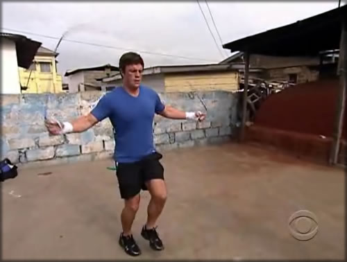 Chad & Stephanie showed up in second place before Brook was done with the speed bag. Where were the other two teams in front of them? Stephanie told Chad to do it. Then the volleyball girls showed up. Katie said she would do it. The trainer told Brook she was done with the bag, which she was practically dancing while punching it. Her hips were swaying back and forth. She did her jump roping while flirting with her trainer the entire time. She finished up before anyone else finished wrapping their hands. The home shopping queens received their next clue.