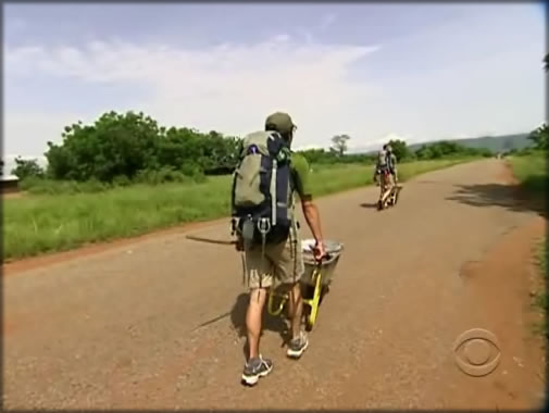 The home shopping queens were headed back up the road with two wheelbarrows when four taxis carrying teams drove by them. It was the father/daughter, Chad & Stephanie, tattoo couple and Jill & Thomas. The father/son team made it to the foreman who told them they needed two wheelbarrows. They turned around to head back. The four new teams that arrived started loading up their stuff when the volleyball girls showed up at the foreman. He said they were missing a trowel. Haha! Calling another team idiots when you forget things too? Hilarious.