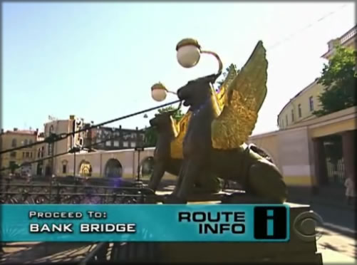 Clue: The teams had to solve a Russian mystery. They had to figure out they were looking for Bank Bridge. It told them to find the bridge that had four creatures with golden wings.