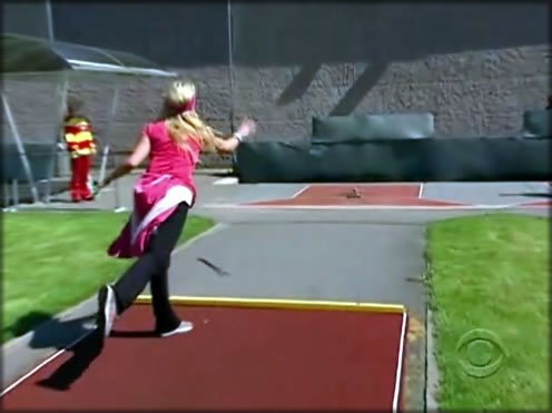 Kat cleared the second formation while Kevin & Michael showed up. Michael decided to do it. Kat missed her third formation completely. Michael threw the stick and knocked down the blocks but none of them left the area. The home shopping queens showed up and Brook decided to do it. Michael threw another stick and missed again. Brook threw her stick twice and sailed over the blocks both times. Kat finally got her third formation done so they finished the road block. They got the next clue.