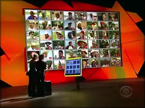 Clue: Teams would work in front of their own screen that looked over an even bigger screen showing 48 different people wearing hats. They had to identify the 11 greeters that were standing next to Phil on the mat at each pit stop. The teams had to put them onto their screens in the correct order. Once they did that, they got their next clue from Bob Eubanks.