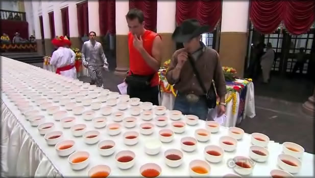 When the teams got inside the Town Hall, it was a road block where one team member would have to try to find the same tea that they tried in China, which was papaya mango. There were hundreds of cups of tea for them to try. The trick with the tea was not just to taste it, but to start smelling them before you tasted them. That helped narrow it down for all the teams that got the clue really quickly. Ron was the first one to discover this technique and was handed a Snapple as his clue. Ron & Christina were wondering where the clue could be. He thought he might have to drink it so he took off the cap and found the clue under the lid. It directed the teams to find the Tiwari Tea Stall to get their next clue.