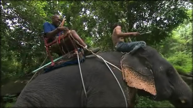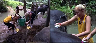 The teams stayed in Thailand for this leg of the race. They started off riding some elephants through part of a jungle to a guy playing a flute above a pool of very dirty water. The teams reached a road block at that point where one team member had to find the next clue in the dirty water while the guy played the flute. I’m not sure what the flute guy had to do with anything since once the team member found the clue in the water, they were back on their elephants and heading out of the jungle.