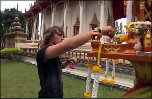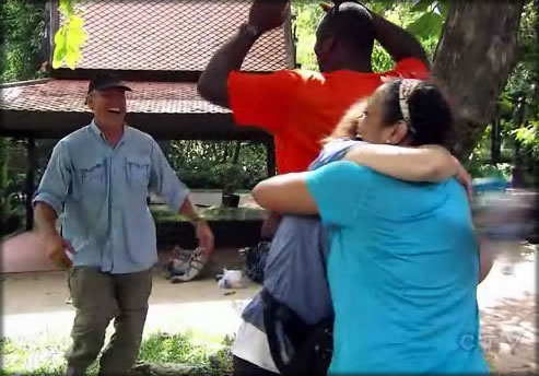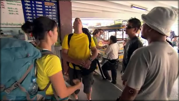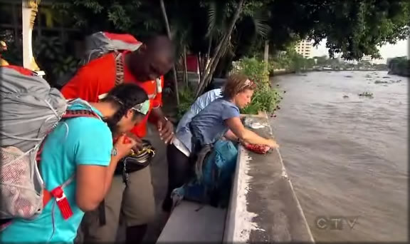 After the spirit houses, the teams had to take a 13 hour bus ride to Bangkok and then find the Bangkok Noi Canal to feed some crazy hungry fish. The snowboarders, brother/sister, and dating divorcees were on one bus that left at 4:30pm. Laurence and Zac got on another bus that left at the same time. Zac commented that their bus was a first class bus and that violated the race rules. Possibly feeling bad about being an ass earlier, Laurence agreed with his son and they jumped off their bus. They ran back three miles and got on another bus. The NFL and farmers left on a bus at 5:30pm.