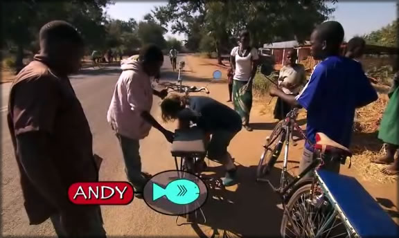 After getting off the bus, the teams had a roadblock where one team member had to deliver a customer carrying a fish off at one of three addresses, collect money and then return it to the bike dispatcher at the starting point. It wasn’t too difficult a task for most teams, even though there were a few things that got them sidetracked. Laurence and Sandy got lost for a bit but they eventually found the same address they were both headed to together. Andy’s bike had a crank fall off of it so he had to stop and fix that with the help of some locals. Then he was on his way. Nothing seemed to slow Cindy down, even with her fabulous comments about how this part of Africa was primitive and she wondered why the kids weren’t in school.