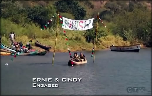 Then Phil checked in the control freaks for second place, followed by the farmers, NFL teams, Laurence/Zac and boring dating couple. Boring dating couple were still in the water when Laurence/Zac got out of the canoes but they didn’t u-turn them. Maybe they forgot they were there like I do each time Iwatch them in an episode. The final team to arrive was Justin and Jennifer. They were eliminated.