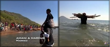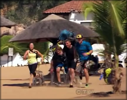 The next clue was a detour where the teams had to choose between paddling in a dugout canoe in part of the ocean around some people and then back to shore or carry a bunch of cargo off of a ship to the beach, including eight people. Obviously, everyone chose the canoe detour, except for the NFL team. Crazy Marcus was carrying people while Amani said she felt like she was going to throw up carrying everything else through waist-deep water. Marcus told  her she could throw up later. Good advice!